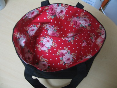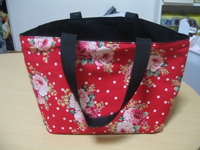 生地は友人の持ち込みで黒の帆布と赤地に花柄。
